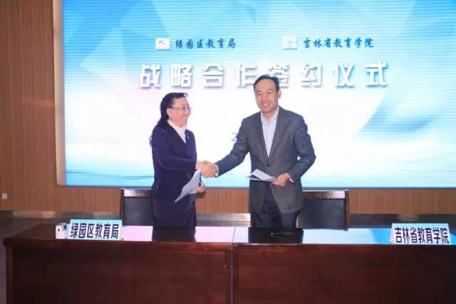 4月21日下午,绿园区教育局“双强计划”启动暨战略合作签约仪式在长春市第八十七中学美润楼隆重举行。绿园区教育局与吉林省教育学院、长春市十一高中分别签署了战略合作协议。吉林省教育学院党委书记赫坚、院长张东航、首席项目组专家龚玲教授,市教育局党委副书记、纪委书记吴海涛,长春市11高中校长杨天笑,吉林省教育学院干训部副主任张岩等领导出席了启动仪式。