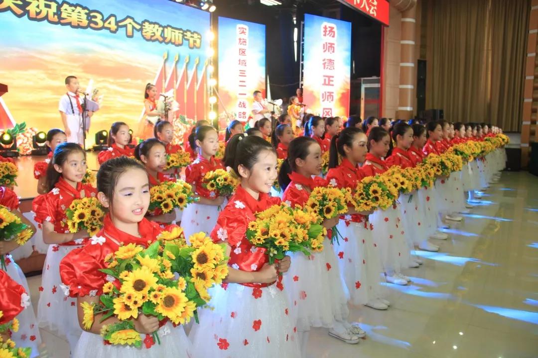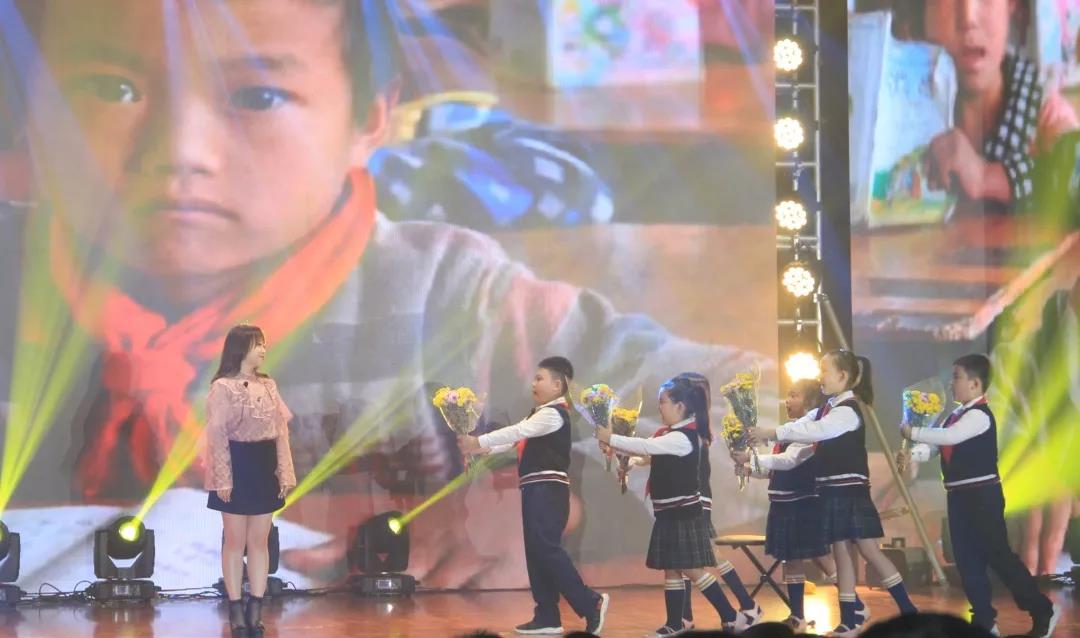 随后,来自全区30余所中小学校、职业学校的师生献上“大爱无声铸师魂”主题演出。演出共分为四个篇章:“爱与使命”篇章,讲述了汶川地震后四川黑水支教、延吉支教、新疆阿勒泰地区结对等教育故事。在“爱与责任”篇章,扎根农村教育的吉林省骨干教师李季带领孩子们上了一堂别开生面的益智成果展示课,孩子们用他们的作品表达着对老师的热爱和祝福。“爱与光荣”篇章,讲述了一位工作34个春秋即将退休的老教师和刚刚走上工作岗位的年轻教师的故事。此篇章演出结束前,少先队员们为部分即将退休和已经退休的老教师代表献上鲜花,全场响起了经久不息的掌声。“爱与奉献”篇章,展现的是正阳小学的老师和同学们共同关爱学校的特殊儿童的故事,让现场的观众再一次感受教师的平凡和伟大。