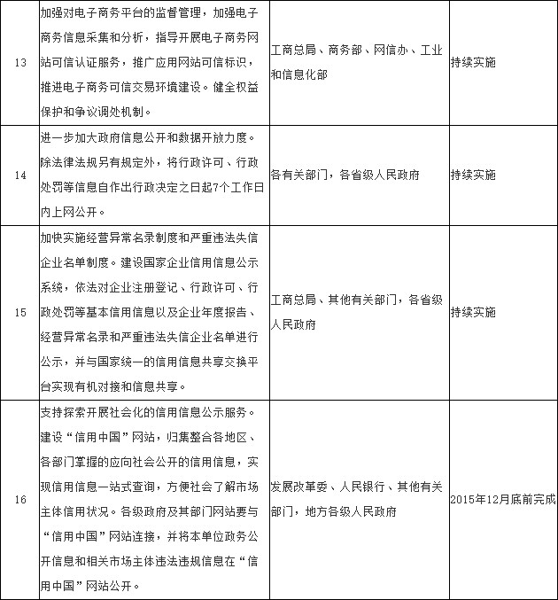 (十九)大力推进市场主体信息公示。严格执行《企业信息公示暂行条例》,加快实施经营异常名录制度和严重违法失信企业名单制度。建设国家企业信用信息公示系统,依法对企业注册登记、行政许可、行政处罚等基本信用信息以及企业年度报告、经营异常名录和严重违法失信企业名单进行公示,提高市场透明度,并与国家统一的信用信息共享交换平台实现有机对接和信息共享。支持探索开展社会化的信用信息公示服务。建设“信用中国”网站,归集整合各地区、各部门掌握的应向社会公开的信用信息,实现信用信息一站式查询,方便社会了解市场主体信用状况。各级政府及其部门网站要与“信用中国”网站连接,并将本单位政务公开信息和相关市场主体违法违规信息在“信用中国”网站公开。