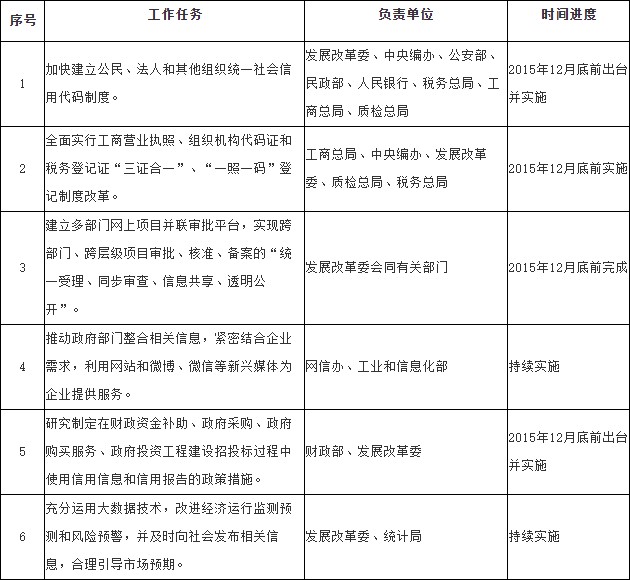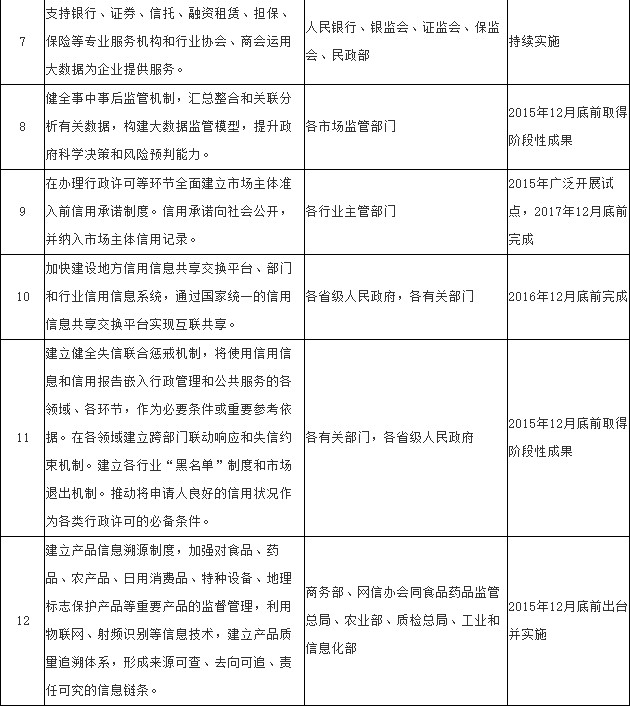 (十二)加快建立统一的信用信息共享交换平台。以社会信用信息系统先导工程为基础,充分发挥国家人口基础信息库、法人单位信息资源库的基础作用和企业信用信息公示系统的依托作用,建立国家统一的信用信息共享交换平台,整合金融、工商登记、税收缴纳、社保缴费、交通违法、安全生产、质量监管、统计调查等领域信用信息,实现各地区、各部门信用信息共建共享。具有市场监管职责的部门在履职过程中应准确采集市场主体信用记录,建立部门和行业信用信息系统,按要求纳入国家统一的信用信息共享交换平台。