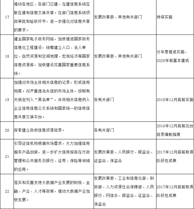 (二十一)有序推进全社会信息资源开放共享。支持征信机构依法采集市场交易和社会交往中的信用信息,支持互联网企业、行业组织、新闻媒体、科研机构等社会力量依法采集相关信息。引导各类社会机构整合和开放数据,构建政府和社会互动的信息采集、共享和应用机制,形成政府信息与社会信息交互融合的大数据资源。