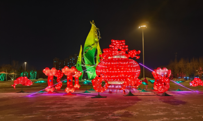 倡节约,做环保节能先锋。方案设计风格节俭精致,选用功率低、寿命长的亮化材料,最大程度做到环保节能。同时,充分利用沿街绿化树木、灯杆为载体,装点多种颜色的灯串和造型彩灯,适当位置点缀小品彩灯,营造线性美化效果,做到功能性和观赏性并举。锦江广场、景阳广场、普阳广场等重要节点,通过设置景观造型灯、点缀彩灯和悬挂灯串进行重点打造,整个亮化项目设置“恭贺新春”“时光隧道”等大型节日景观灯组9座,蒲公英、马蹄莲等夜景小品170套,灯笼、雪花等挂件13600套,灯串、灯网20000套。