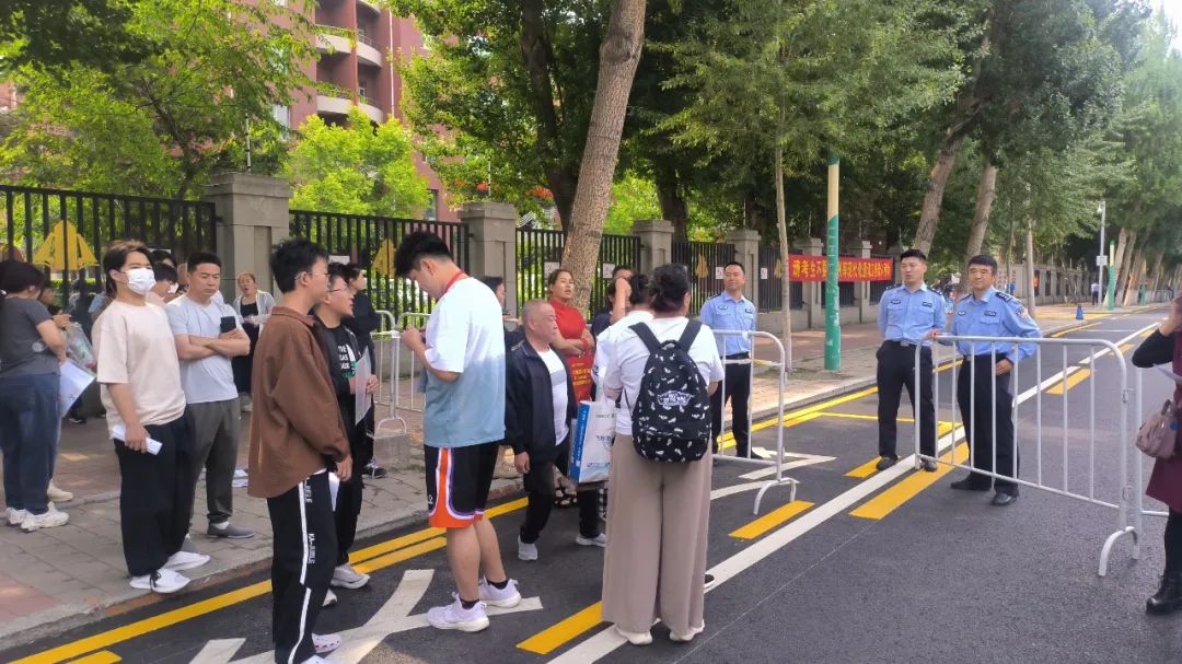 由海迎社区新时代文明实践站志愿者组成的“送考”队伍守候在考场周围,为高考家长及志愿服务车队发放小扇子等物品,并与送考家长交流沟通,帮助他们舒缓紧张情绪。