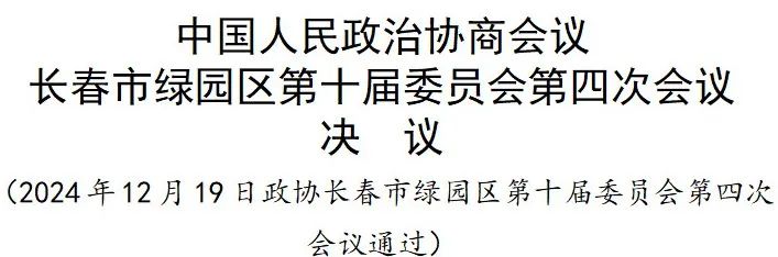 中国人民政治协商会议长春市绿园区第十届委员会第四次会议于2024年12月16日至19日举行。