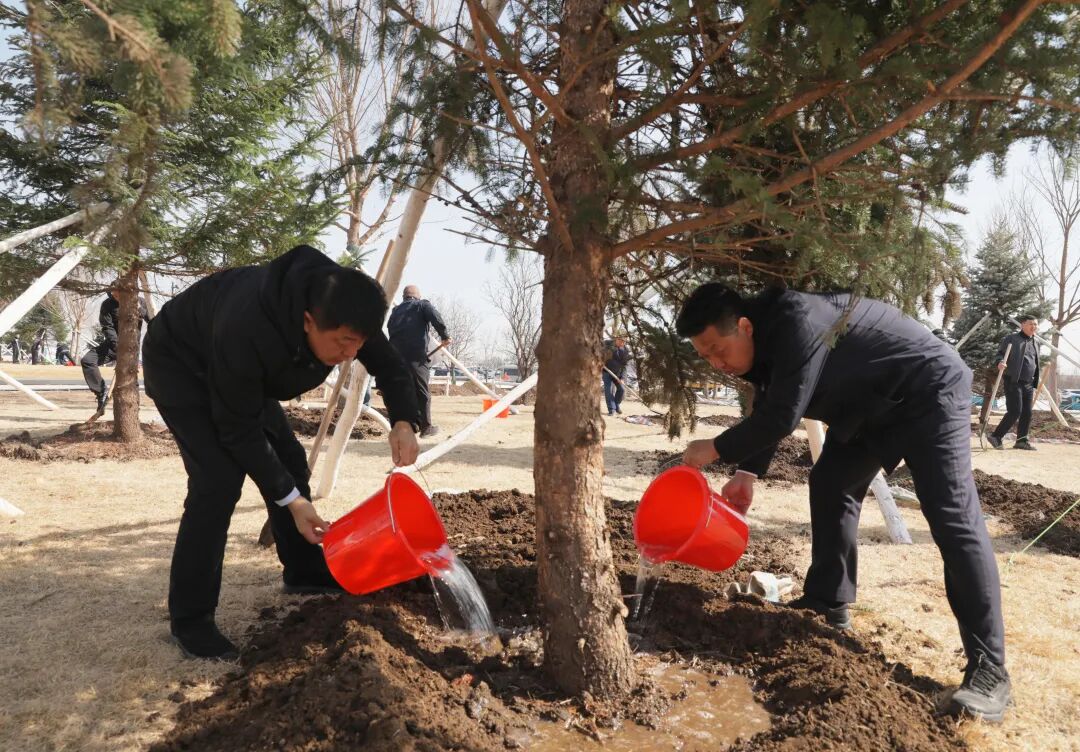 活动现场处处洋溢着热火朝天的劳动景象。区领导与机关党员干部三五人一组、分工协作,挥锹铲土、扶苗定植、培土围堰、提水浇灌,每一个环节都认真细致、一丝不苟,用双手栽种下圆柏、山槐、五角枫等树苗,也种下了守护绿色生态、助力航博发展的美好心愿。大家一边劳动、交流植树技巧,一边分享生态保护心得,探讨航博城未来发展,在协同劳作中凝聚合力。
