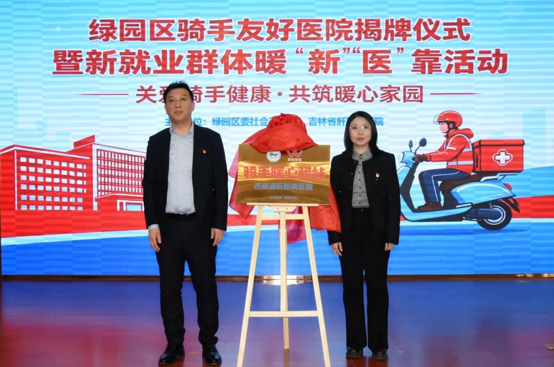吉林省肝胆病医院主要负责同志介绍骑手友好医院建设情况。随后,区委社会工作部主要负责同志为绿园区骑手友好医院揭牌,标志着绿园区新就业群体健康服务保障工作迈出坚实一步。